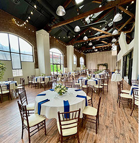 Refinery North is located at 500 Missouri Avenue, Jeffersonville, IN 47130. This space is approximately 6000 square feet on the main floor with an L-shaped floor plan and second floor Mezzanine. The recommended max capacity for a seated dinner is 350 guests at tables of ten with room for a dance floor, buffet, and bar. More guests may be accommodated depending on the needs of the event. This space can also be divided into two smaller event spaces which can be used for a medium-sized ceremony and reception or corporate meeting and lunch space. Refinery North also includes access to the North Lounge which can serve as a great bridal party suite or band green room. When Refinery North is rented access to the North Lounge begins at 10:00AM on the event date.
