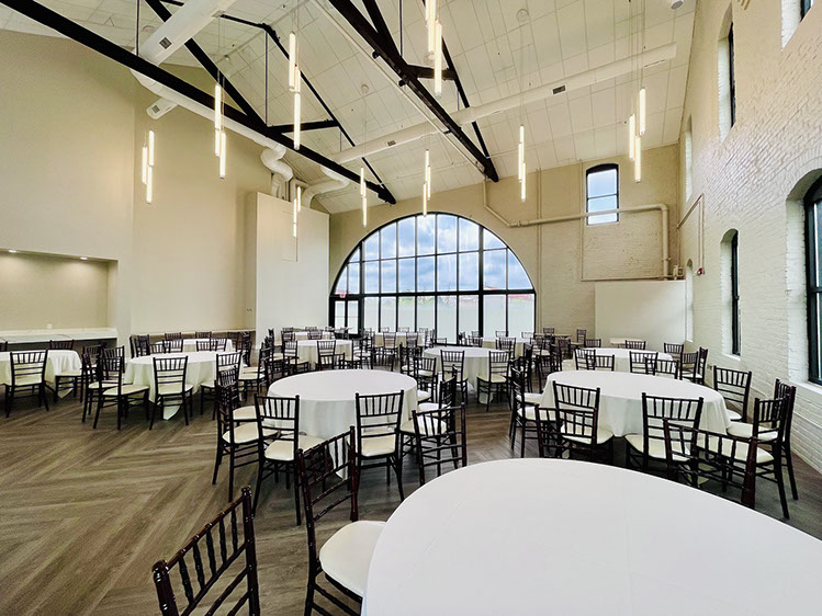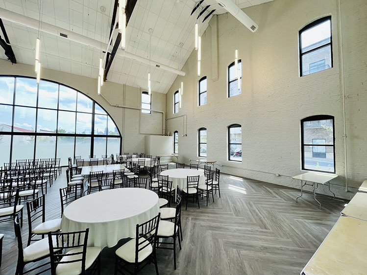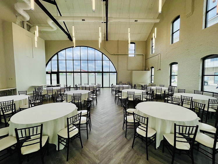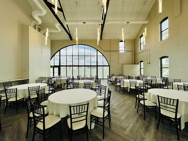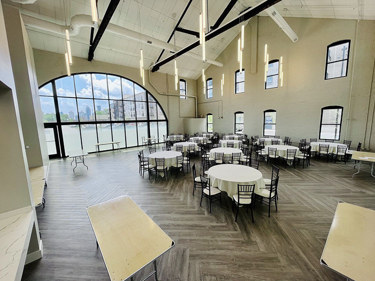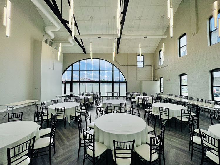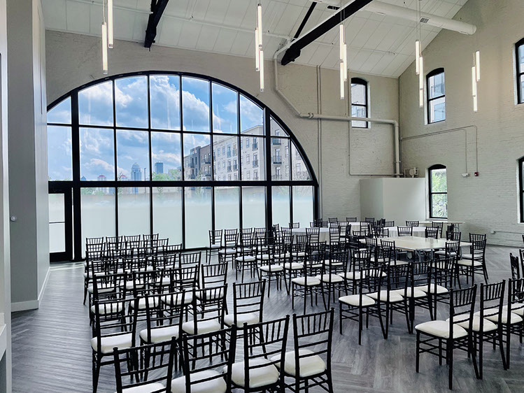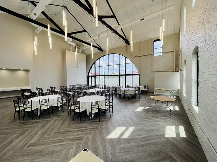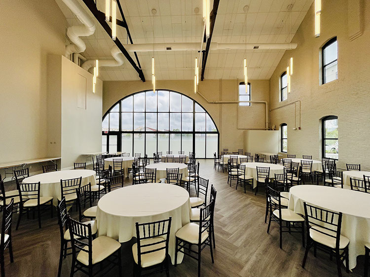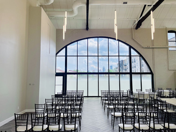 The Reserve is located at 380 Missouri Avenue, Jeffersonville, IN 47130. Designed as an intimate event space at approximately 2400 square feet, maximum posted capacity of 130 for a seated dinner. This space features an enormous, picturesque, arch window facing South to showcase the Louisville skyline and George Rogers Clark Memorial Bridge. Neutral finishes with modern styling allow for the event space to easily blend with any decor and event type. This space is perfect for intimate wedding receptions, bridal showers, baby showers, and corporate meetings.