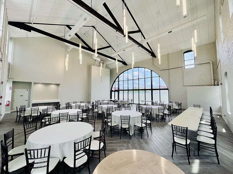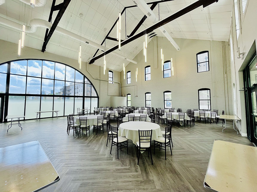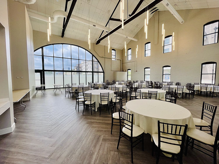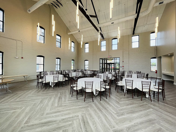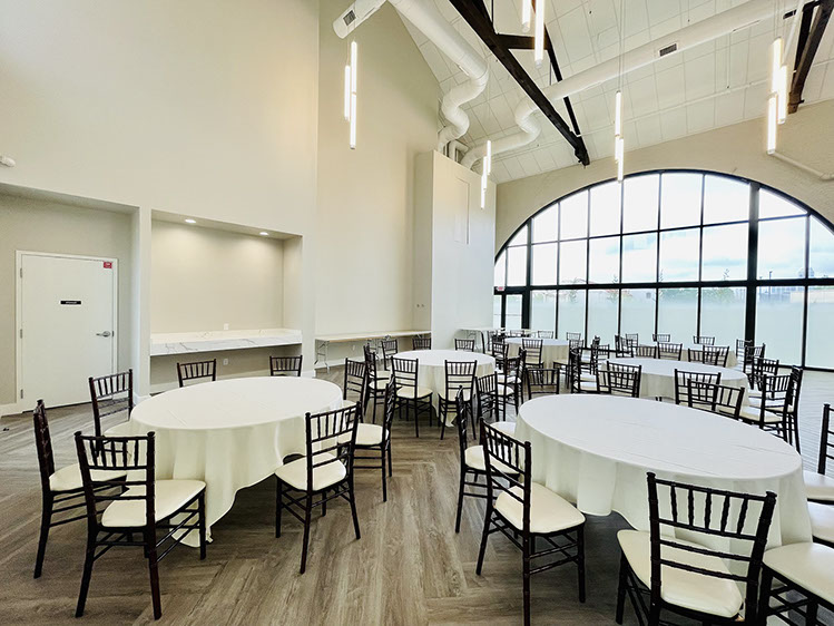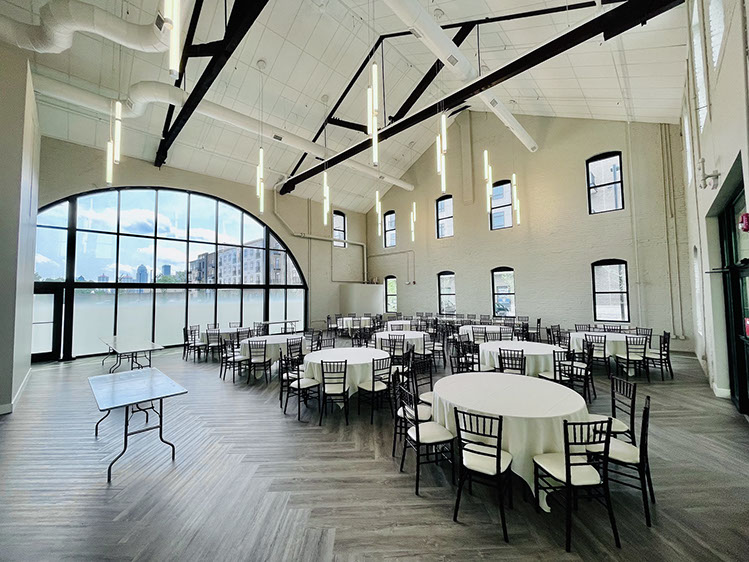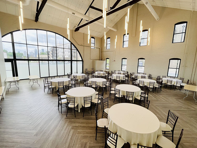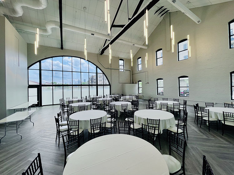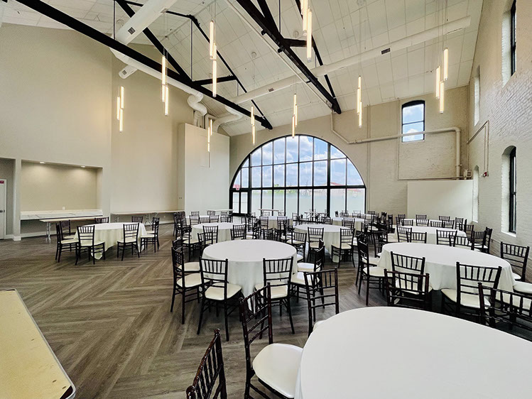 The Reserve is located at 380 Missouri Avenue, Jeffersonville, IN 47130. Designed as an intimate event space at approximately 2400 square feet, maximum posted capacity of 130 for a seated dinner. This space features an enormous, picturesque, arch window facing South to showcase the Louisville skyline and George Rogers Clark Memorial Bridge. Neutral finishes with modern styling allow for the event space to easily blend with any decor and event type. This space is perfect for intimate wedding receptions, bridal showers, baby showers, and corporate meetings.