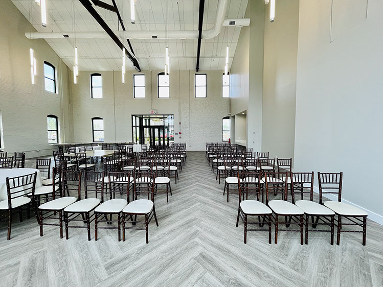 Chairs included in the rental of the space are different than the chairs currently pictured below. The rental of the space will include 100 diamond back wooden chairs with no cushions as pictured below.