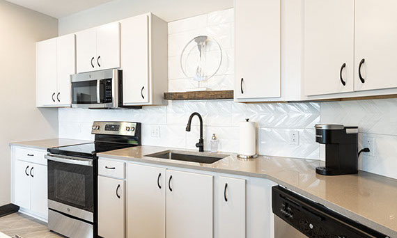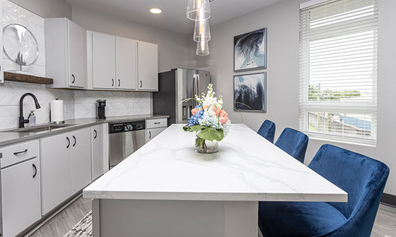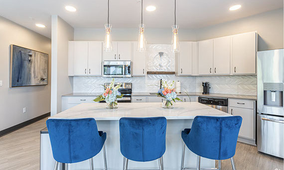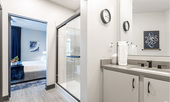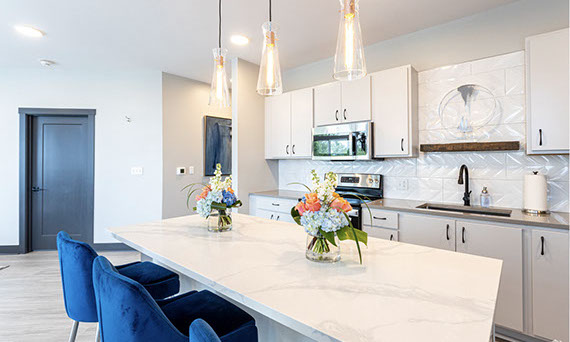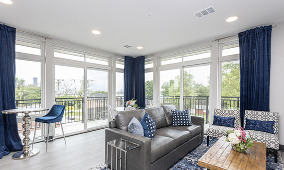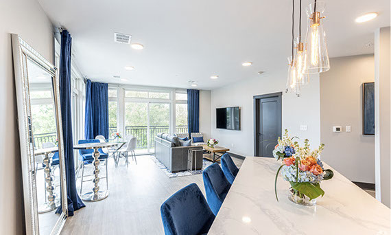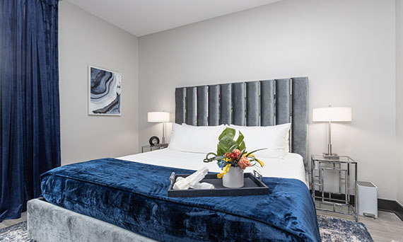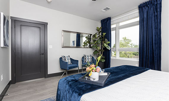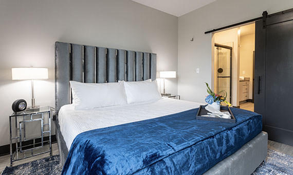 The Riverview Lounge is located in Bolt + Tie at 1400 Main Street, Clarksville, IN 47129, just southwest of The Refinery and immediately west of The Foundry and The Reserve. This lounge is available for any Client to add to their event date. The Riverview Lounge is a 900+ square foot, one bedroom apartment that is stylishly furnished with views overlooking the Ohio River and downtown Louisville. With this rental, you would also have the opportunity to utilize the building's rooftop to take pictures which boasts the incredible views of the Louisville skyline. This space rents for $1000 plus sales tax for a 50 hour stay with check-in at 10:00AM and check-out at 12:00Noon. For a Saturday event, this means you can access the Riverview Lounge at 10:00AM Friday morning, enjoy two overnight stays, and check-out at 12:00Noon on Sunday (timing can be adjusted based on the day of the week your event is occurring).